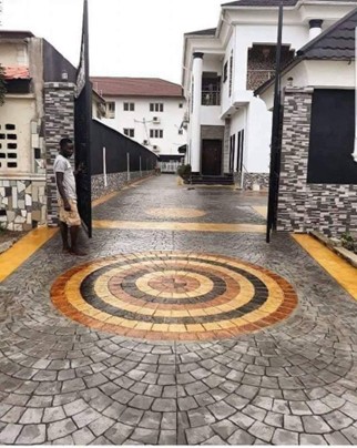Completion of a high-end residential entrance featuring custom stamped concrete paving with a vibrant, circular design at the focal point. This project highlights our expertise in creative civil finishing, durable hardscaping solutions, and bespoke entrance gate installation. The work ensures both aesthetic appeal and long-term durability, creating a premium first impression for the estate.