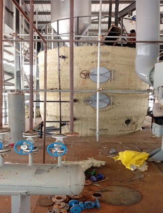 On-site work demonstrating the installation of thermal insulation on a large industrial pressure vessel or boiler to maximize energy efficiency and operational safety. The foreground shows the complex piping, valve components (including blue-handle control valves), and fittings being prepared for integration. This highlights Jaybus Nigeria Limited's expertise in specialized mechanical construction, process equipment setup, and industrial compliance.